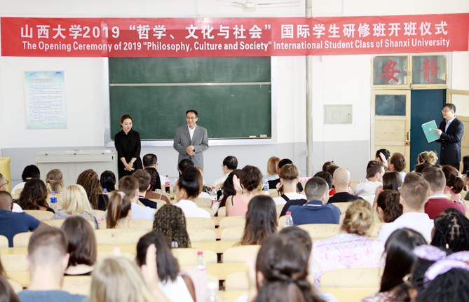 9月30日上午,山西大学哲学社会学学院“2019‘哲学·文化与社会’国际学生研修班”开班仪式在山西工商学院好学楼201教室举行。参加开班仪式的国际友人有法国巴黎高等学院中国办公室主任张静慧女士、国际交流部主任爱丽丝女士、学院教师斯坦法尼女士,山西大学党委常务副校长周小计、山西大学国际教育交流学院党委书记李光跃、院长朱鲁军,哲学社会学学院党委书记郭剑波、院长孙岩,以及两学院其他相关领导共同出席了开班仪式。来自法国巴黎高等学院相关高校的87位学生参加了开班仪式。开班仪式由山西大学国际教育交流学院院长朱鲁军主持。