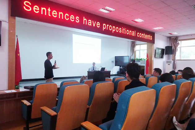 Thomas Hodgson (霍奇森)博士于2019年6月应邀来88858cc永利官网访问讲学,在88858cc永利官网报告厅作了题为“A defence of structured propositions”(结构化命题的定义)与“Sentences have propositional contents”(有命题内容的句子)的两场讲座,88858cc永利官网全体研究生及部分本科生和青年教师到场聆听报告。